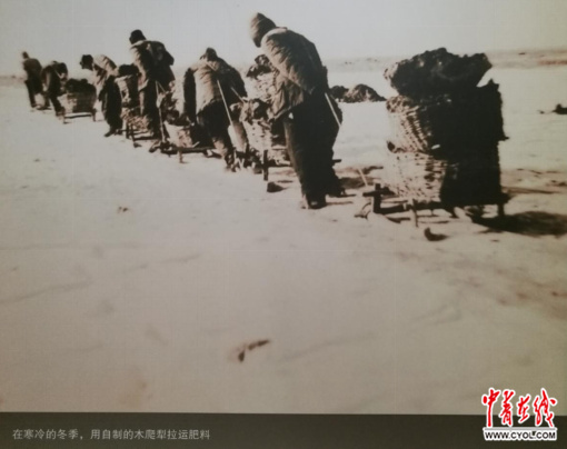 在寒冷的冬季,用自制的木耙犁拉运肥料。中国青年报·中青在线记者 郭艳丽/摄