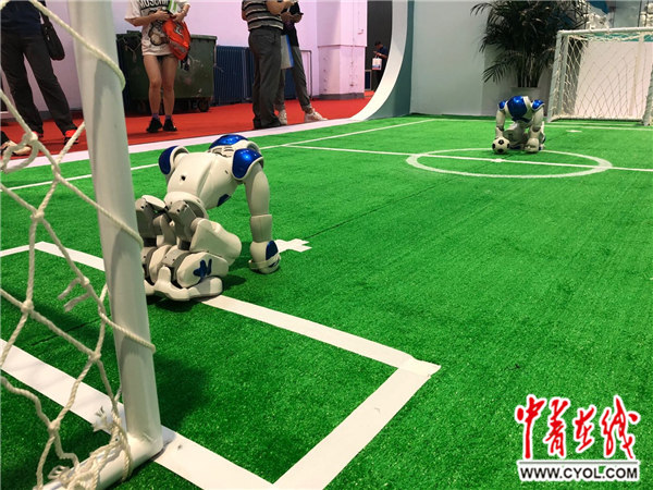 从机器人手里买到奶茶后,记者又随小朋友们驻足在一片绿茵场前,那儿有两位正在休息的机器人足球选手。他们来自SoftBank Robotics公司,据该公司中国区销售总监齐建伟介绍,这款名为NAO的双足机器人是Robot World Cup(机器人世界杯)5对5足球赛的指定平台。来自各类机构的参赛选手基于该平台进行二次开发,以期推动人工智能相关技术的发展,“最终目标是希望在50年之后用机器人的足球队打败人类世界冠军足球队”。
