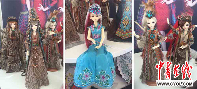 “这是我设计制作的第一批娃娃,之前参加一次展览时,曾有人出价2000元一个,买全套娃娃,我都没有卖。”她像夸赞自家孩子一样略带骄傲地说,“这些娃娃的衣服都是纯手工制作,每个娃娃代表一种文化,这是龟兹文化、这是楼兰文化……现在,这些娃娃只有一批,但是未来会实现规模化生产。”