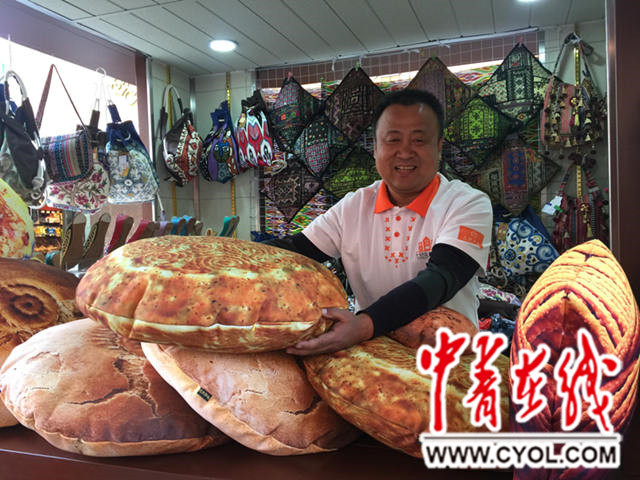 一家商户正在向游客叫卖“烤包子”样式的新疆原创品牌抱枕。