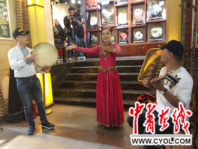 新疆国际大巴扎内的一家工艺品商铺前,一名新疆小伙打着手鼓招揽顾客。