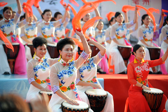 9月23日,在安徽省亳州市魏武广场天幕剧场,文艺爱好者在展示才艺。9月23日,一场主题为“喜庆‘双节’ 雅韵亳州”的传统文化交流活动在安徽省亳州市魏武广场天幕剧场举行,文艺爱好者们为市民带来茶艺、古筝、旗袍走秀、舞蹈等精彩表演。张延林/摄(新华社发)
