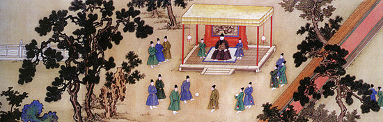明宣宗行乐图(局部)《明宣宗行乐图》为明朝宫廷绘画中的堂皇巨作,分为六部分,从射箭、捶丸、蹴鞠、投壶、坐轿等方面表现了明宣宗朱瞻基的超豪华宫廷生活。