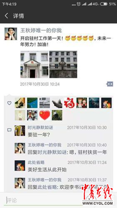 2017年10月30日,王秋婷在朋友圈发了一条微信:“开启驻村工作第一天。未来一年努力!加油!”