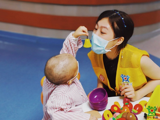 中山大学附属第一医院血液科,志愿者与患白血病的孩子在一起。童心童路志愿服务团队供图