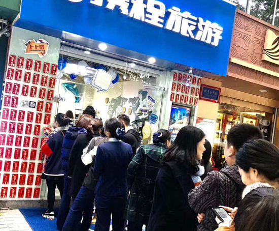 3月22日下午,某旅游机构门店门口旅游咨询者排起长队。 彭亮/摄