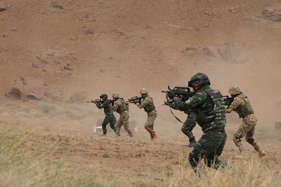 空中战鹰低悬,地面铁甲风驰电掣,水上冲锋舟破浪前行……8月6日,为期8天的中吉“合作-2019”联合反恐演练在新疆乌鲁木齐市近郊某基地拉开战幕,中国武警部队“山鹰”突击队与吉尔吉斯斯坦国民卫队“黑豹”特战旅官兵聚集天山脚下,共同打响反恐练兵之战。