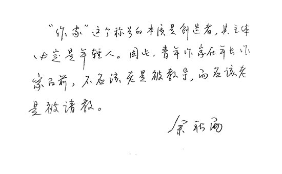余秋雨:很多年长的学者认为,一个年轻人想成为作家,需要做很多方面的准备。但我的想法不太一样,想成为一个好的作家,首先要尽力维持自己的天性,不受太多污染,也就是以天真天籁的心境,敏感察觉世间不同形态的美,并且不断寻找让自己喜悦的表达方式。如果让各种“准备”扰乱了自己的天性,反而得不偿失。