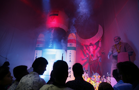 当地时间9月6日,印度艾哈迈达巴德,印度民众在当地神庙祈祷“月球2号”顺利登月。视觉中国供图