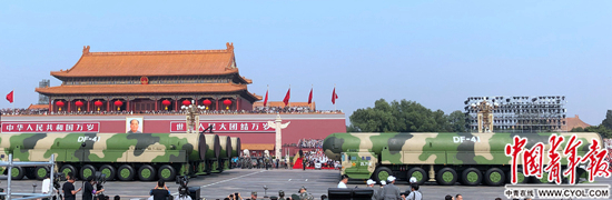 10月1日,庆祝中华人民共和国成立70周年大会上,东风-41核导弹方队经过天安门广场。中国青年报·中国青年网记者李隽辉/摄