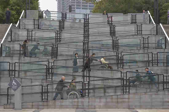 2014年12月1日,重庆市江北区江北嘴科技馆无障碍通道上,坐轮椅的人在亲人和志愿者的陪同下向上攀登。视觉中国供图