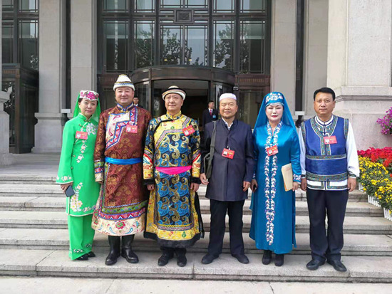 马逢武(右三)在北京参加全国民族团结进步表彰大会期间和各族代表在一起。受访者供图