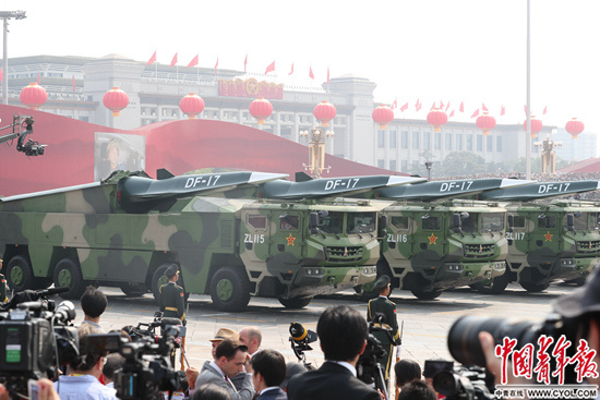 10月1日,庆祝中华人民共和国成立70周年大会上,东风-17常规导弹方队经过天安门广场。中国青年报·中国青年网记者赵迪/摄