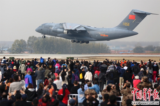 10月18日,庆祝人民空军成立70周年航空开放活动首个公众日,空军运-20运输机在跑道上短距离起飞。