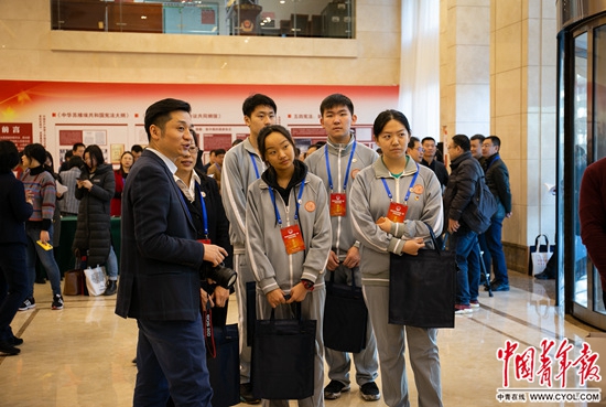 12月3日,司法部机关,工作人员为北京市第六十六中学的学生讲解展板内容。中国青年报·中国青年网见习记者 张玉佳/摄