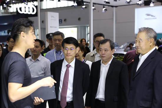 在2020(第二届)海口国际新能源暨智能网联汽车展览会上,海南省人民政府副省长沈丹阳(前排右三)、中国机械工业联合会会长王瑞祥(前排右一)、中国国际贸易促进委员会汽车行业委员会会长王侠(前排右二)正在了解新能源汽车发展的最新情况。