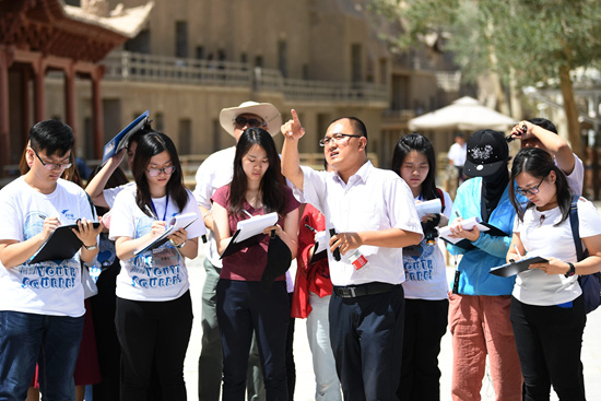 敦煌研究院讲解员边磊(前)为香港大学生讲解莫高窟历史(2018年7月12日摄)。新华社记者 陈斌/摄