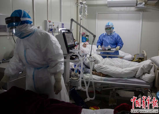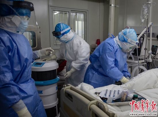2月21日,武汉火神山医院感染八科一区,医护人员准备为一名新冠肺炎患者采动脉血样做血气检查。中青报·中青网记者李峥苨/摄