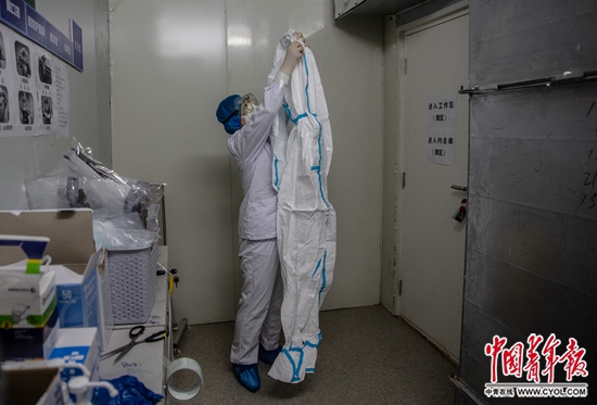 2月21日,武汉火神山医院感染八科,一名医护人员准备穿上防护服进入病区。中青报·中青网记者 李峥苨/摄