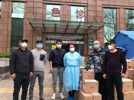 武汉市中心医院医生接收志愿者送去的物资。