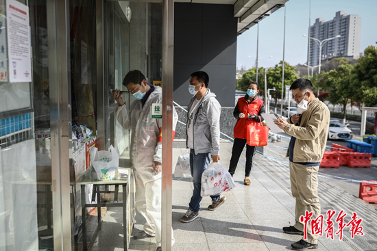 3月19日,湖北省武汉市一家药店,几名志愿者在帮忙买药。中青报·中青网记者 赵迪/摄