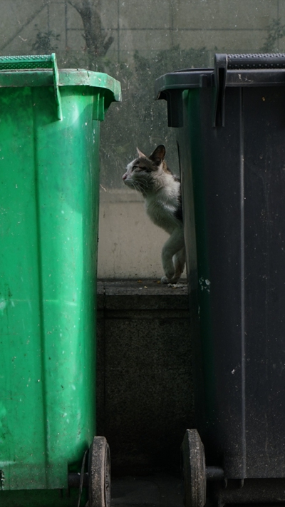 3月11日,封城之后,一家尚在营业的酒店楼下,流浪猫在垃圾桶旁觅食。