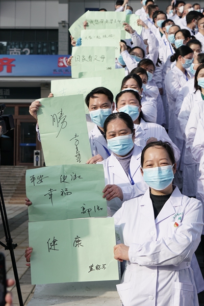 3月10日,在方舱医院的休舱仪式上,武汉市第三医院的医护人员在纸上写下愿望。