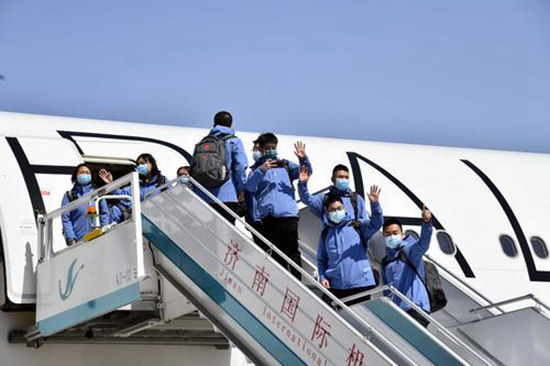 3月28日,济南遥墙国际机场,山东省赴英国联合工作组成员登机。这支队伍的任务是慰问在英华侨华人、中资机构和广大留学生,并支援当地抗击新冠肺炎疫情。郭绪雷/摄(新华社CNML图片)