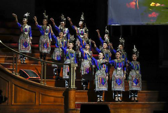 1月25日,全英中国留学生春节联欢晚会在伦敦举行。中国贵州省歌舞剧院演员演唱侗族大歌。韩 岩/摄(新华社CNML图片)