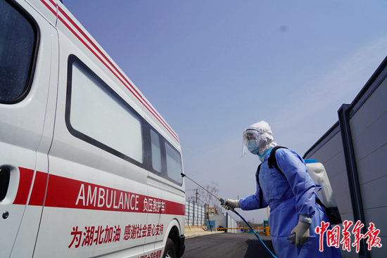 张鹏飞为外出接运病人的救护车消毒。中青报·中青网记者耿学清/摄