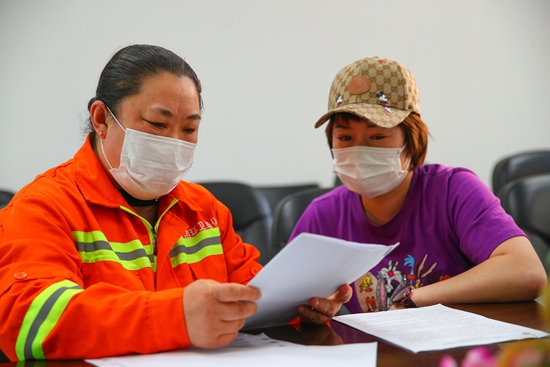 全国人大代表庄艳(左)是辽宁省鞍山市立山区恒洁环卫绿化服务有限公司的垃圾清运工。当选全国人大代表后,她迅速进入角色,不断学习提升自己,经过大量走访调研、查阅资料,庄艳的建议越来越有针对性、更具可操作性。图为庄艳在工作单位接待来访群众。新华社供图