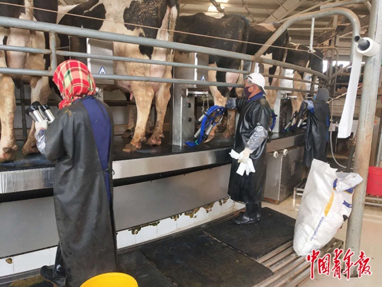 养殖场离家不远,骑车10分钟就到了。换上工作服后,王吉乐立刻投身到牛场的饲养棚中。“我和工友得扎扎实实干3小时,才能给全场5000头奶牛填满饲料。”等忙活完,已经快8点了,太阳照在身上暖融融的,这时,王吉乐才有时间舒展一下身子。