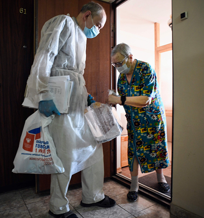 当地时间6月29日,工作人员带着移动票箱进入莫斯科一处公寓楼,供居民投票。从6月25日起,俄罗斯就包括修宪案在内的一系列议题举行全国性公投。为应对疫情防止人群聚集,设定了长达7天的投票时间。新华社/法新