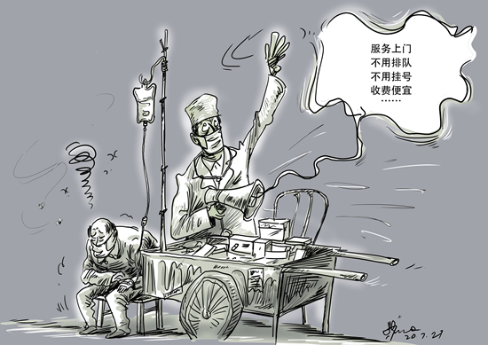 据北京市公安局通报,北京警方联合卫健部门开展了集中打击整治非法行医专项行动。6月以来共捣毁“黑诊所”、倒卖药品“黑窝点”30处,拘留48人,收缴涉案药品3.1万余盒。其中,有所谓“牙医”拉着买菜小车“出诊”,因涉嫌非法行医罪被依法刑事拘留。(北京日报客户端)漫画:徐简