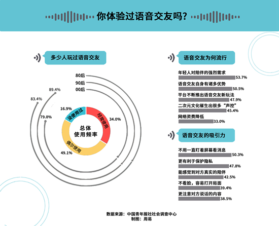 近日,中国青年报社社会调查中心通过问卷网(wenjuan.com),对2004名受访者进行的一项调查显示,83.1%的受访者体验过语音交友,其中34.0%的受访者经常使用语音交友。以打发时间为主要动机的受访者最多,然后才是找对象、交朋友。53.7%的受访者将语音交友的流行归因于年轻人对陪伴的强烈需求。