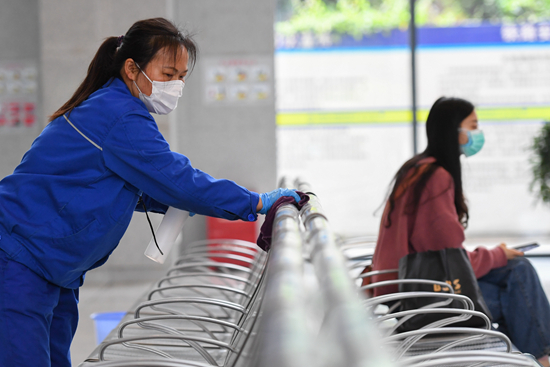 随着复工复产的持续推进,针对客流量逐步提升的情况,长株潭城际铁路实施常态化疫情防控,包括车站公共区域定时消毒,出站口附近设置留观室,工作人员须佩戴口罩上岗,乘客须全程佩戴口罩,并在进站口、出站口接受体温测量等,保障乘客健康安全出行。图为工作人员在长株潭城际铁路长沙站候车厅给座椅擦拭消毒。新华社记者陈泽国/摄(资料图片)