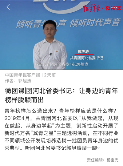 大家好,我是团河北省委书记郭旭涛,很高兴和大家见面。今天由我为大家讲微团课,团课主题是《新时代“冀青之星”闪耀基层》。