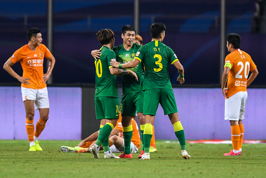 9月6日晚,北京中赫国安队球员张玉宁(中)进球后与队友庆祝。新华社记者 李博/摄