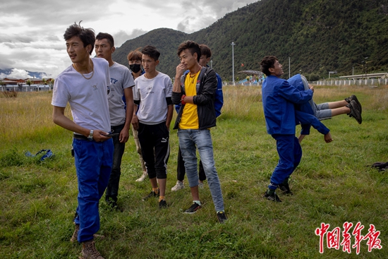 学校挖掘机班的40多名学生都来自波密县多吉乡,他们从小一起长大,岁数相差无几,在务农之外寻找其他生计。学校有3台教学用的挖掘机,学生们每人每天能轮流上机实操一个小时左右。等待上机的时间里,27岁的班长索朗占堆会带着“小兄弟们”在草地上跳当地传统的锅庄舞,用手机录下来发到网上。他们向往着外面的世界,也期待着通过学到的技术,走出牧区,奔向小康。