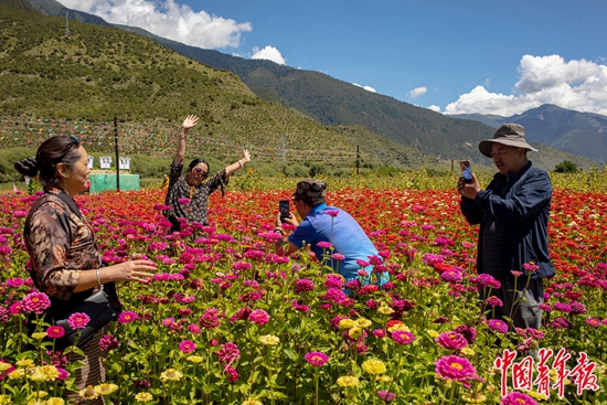8月27日,林芝市巴宜区米瑞乡姆多村花海景区,游客们拍照留念。景区里向日葵、波斯菊等花卉盛开,2019年净收入10万元。