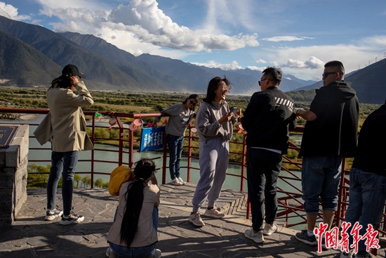 8月27日,林芝市苯日景区,游客们在可以眺望雅鲁藏布江与尼洋河交汇处的观景高台上。