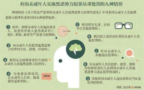 2020年4月23日,最高法、最高检、公安部、司法部发布《关于依法严惩利用未成年人实施黑恶势力犯罪的意见》(下称《意见》),明确提出对9种利用未成年人实施黑恶势力犯罪的情形从重处罚,特别是要对利用未成年人实施犯罪的黑恶势力首要分子、骨干成员、纠集者、主犯和直接利用者五类人员从重处罚,要求在侦查、起诉、审判、执行各阶段,全面体现依法从严惩处。