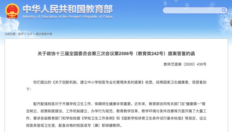 中国青年报客户端北京2月1日电(中青报·中青网记者 樊未晨)记者今天从教育部获悉,教育部在关于政协十三届全国委员会第三次会议第2506号(教育类242号)提案答复的函中指出,配齐配强校医对于开展学校卫生工作、保障师生健康非常重要。近年来,教育部会同有关部门,要求各级教育部门和学校依据《学校卫生工作条例》和《国家学校体育卫生条件试行基本标准》等规定,设立校医务室或卫生室,配备合格的校医或专(兼)职保健教师。教育部也将积极开展试点研究,探索校医定向委培招生培养工作、全科医学教育人才培养、医疗机构派驻、政府购买校医服务等多种渠道和策略,以解决专业校医配备问题。