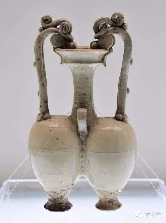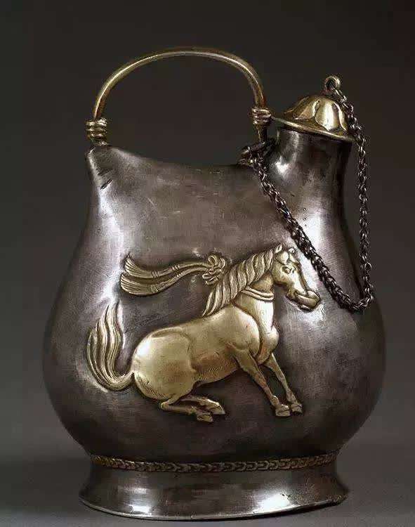 其中双龙柄壶器形独特,天津地区曾发现一件传世的双身龙柄壶,底阴刻“此传瓶,有□”,表明当时此类器物可能称为传瓶。一件西安何家村窖藏出土的一件银鎏金舞马衔杯纹仿皮囊壶是皮囊式壶的代表。