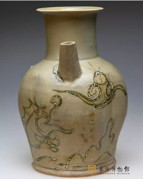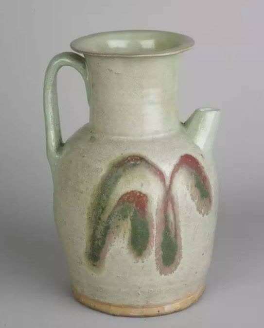 除了因为留存大量民间唐诗的这一特点,长沙窑也首创了釉下彩绘、铜红釉等,长沙窑的发掘将铜红釉彩的创烧提前了几百年。唐代釉下彩主要有三种着色剂,其一是以氧化钴为主要着色剂的青花,其二以氧化铁为主要着色剂的褐彩与黑彩,其三是以氧化铜或氧化亚铜为主要着色剂的绿彩与红彩。长沙窑釉下彩瓷器主要是以氧化铁和氧化铜为主要着色剂,在一件器物上往往几种颜色同时出现。如下面的这件铜官窑白釉红绿彩瓷壶,同时呈现红绿彩,且红彩鲜亮,因而十分珍贵。
