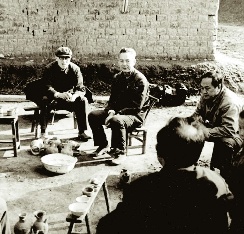 1980年代初,潇湘(右下方背对者)代表长沙考古队,向故宫博物院派出的冯先铭、李辉柄等古陶瓷专家介绍情况,并一起做实地调研。