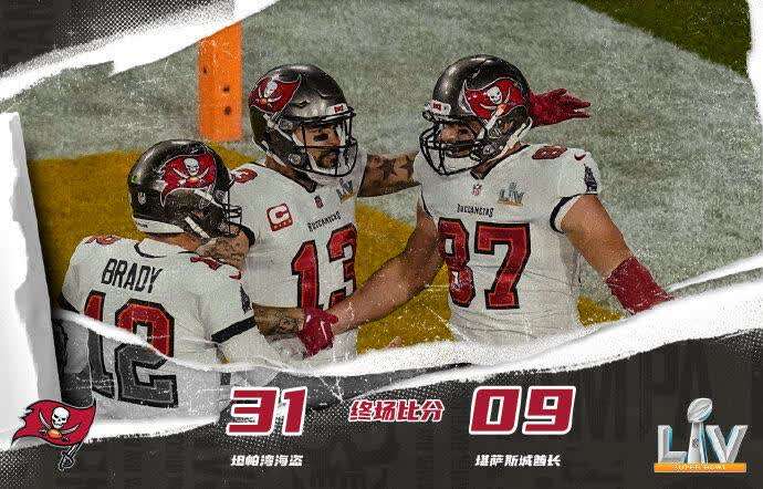 中新网2月8日电 北京时间8日,第55届超级碗落下帷幕。NFL传奇四分卫汤姆-布雷迪率领坦帕湾海盗在主场兵不血刃,以31:9完胜堪萨斯城酋长,获得冠军。