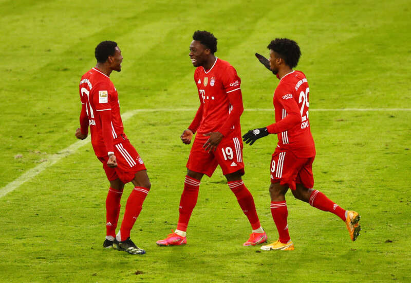 2月15日,拜仁慕尼黑队球员戴维斯(中)在进球后与队友阿拉巴(左)和科曼庆祝。
