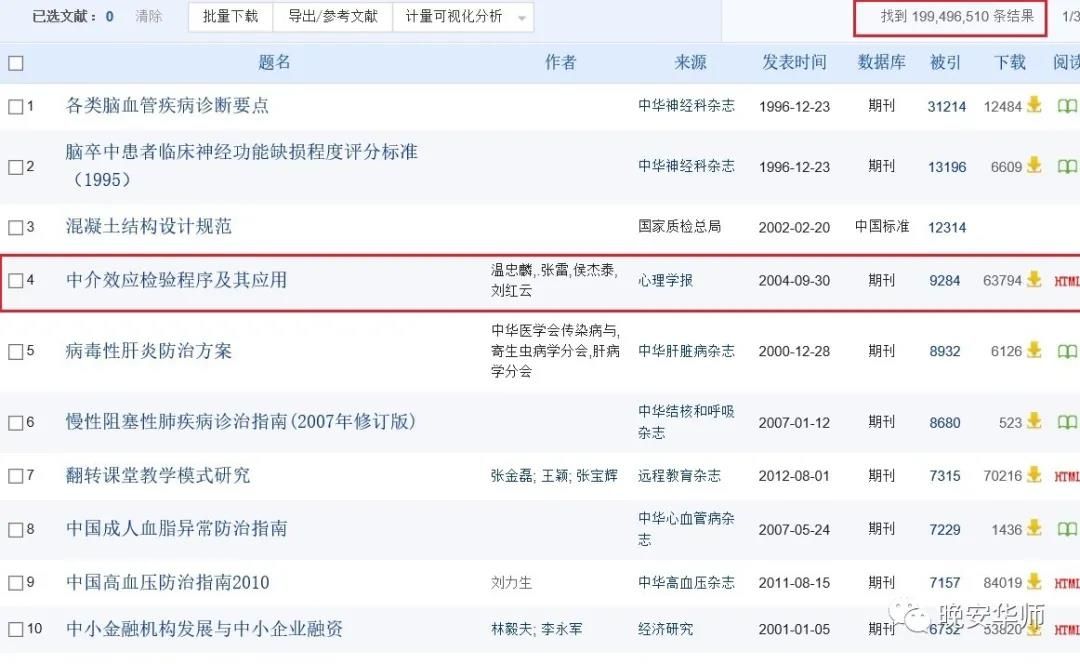 早在2019年底,温忠麟于2004年发表在《心理学报》上的《中介效应检验程序及其应用》一文被引量,就位居中国知网第一。在此后的13个月里,该论文的引用数量增加了1700多次,比第二名高出近2千次。