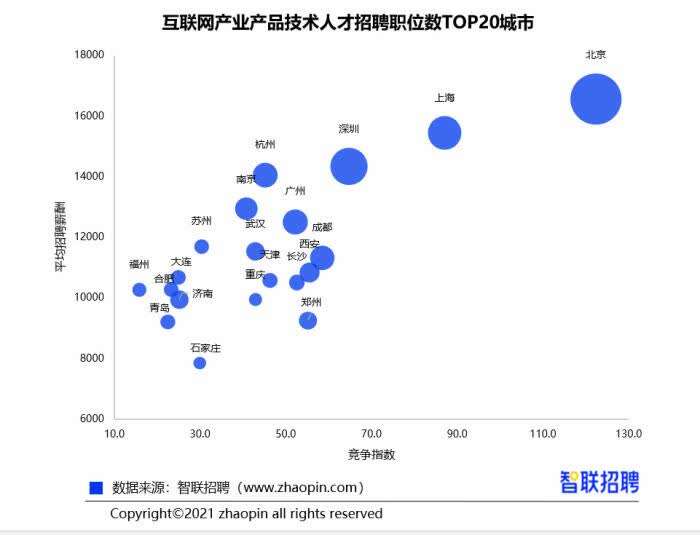 数据显示,2020年,一线城市对互联网产品技术人才招聘需求更旺盛,占比43.8%;其次是新一线城市,占比33.1%。